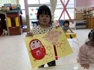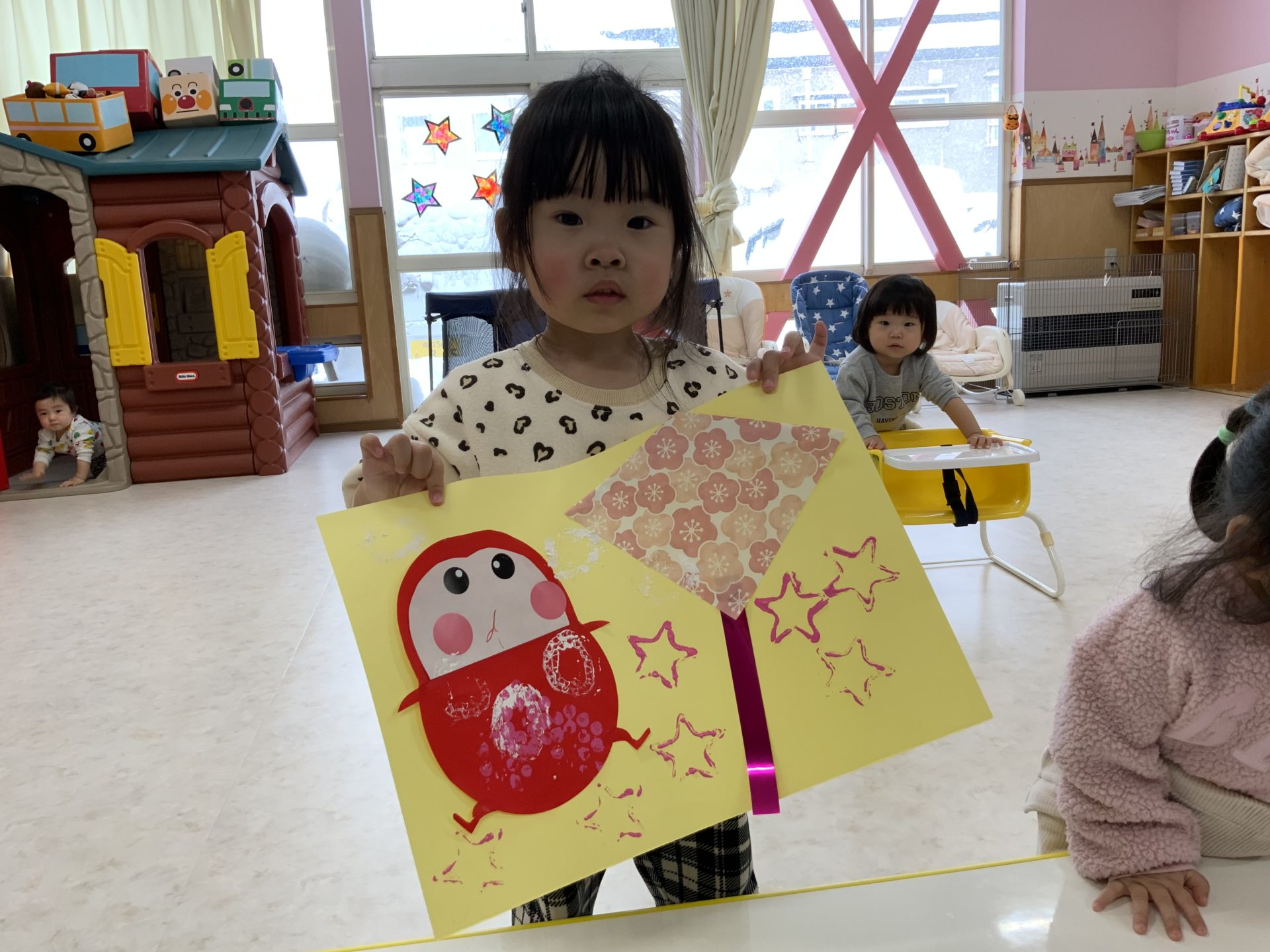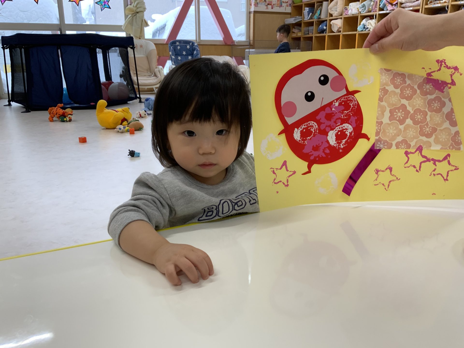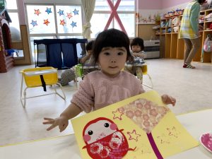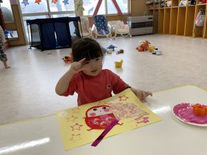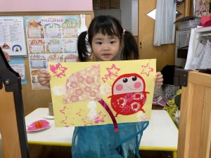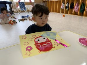 目、鼻、口の位置も徐々にどこが良いのかわかって来たようで、すてきなだるまさんが完成していましたよ❤️