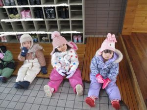 スキーウェアを身につけて、準備を整えていく最中もみんなニコニコ♩