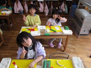 担任の先生が出したクイズの答えを子どもたちが考えて粘土で作っていきます。