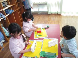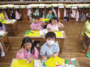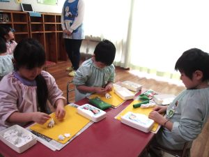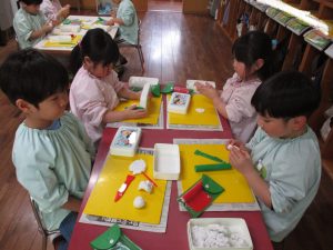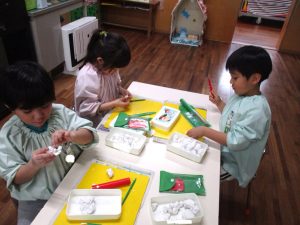今回は『雪だるま』を作っていく様で、白い折り紙を使って頑張って作り上げていましたよ!