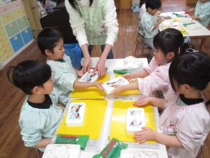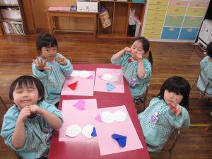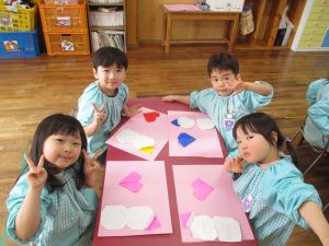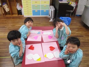 雪だるまの周りにはハートの折り紙を貼り付けたり、雪だるまにそれぞれ好きな色の折り紙で作った帽子を被せたりして上手に作っていました。