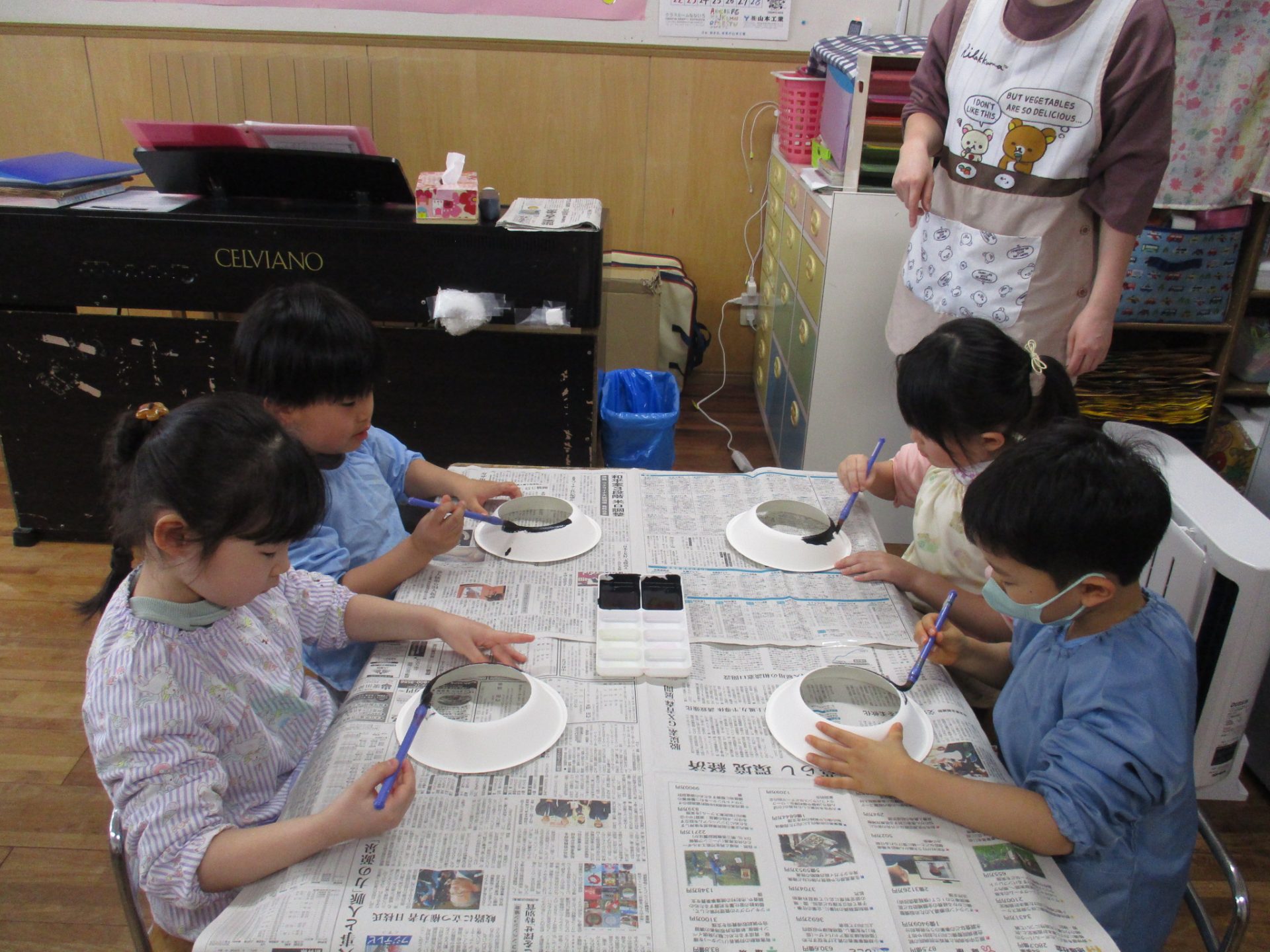 紙皿のフチの部分を、黒色絵の具で縁取っていきましたよ♩