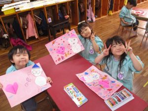 今日は昨日折り紙で作った雪だるまやハート折り紙の周りにクレヨンで描画を行なっていきました。