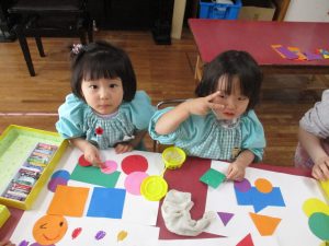 今日はお部屋で三角・丸・四角など色々な形に切っておいた色画用を組み合わせて、様々な物を作っていく活動に取り組んでいました。