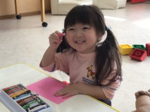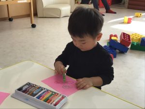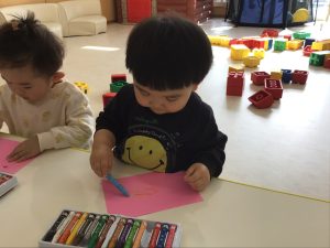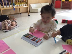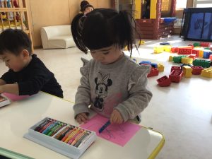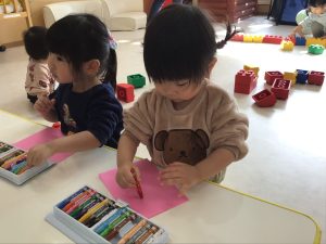 それぞれの好きな色のクレヨンを手に持つと色画用紙にグルグルと、なぐり描きをしていましたよ♩