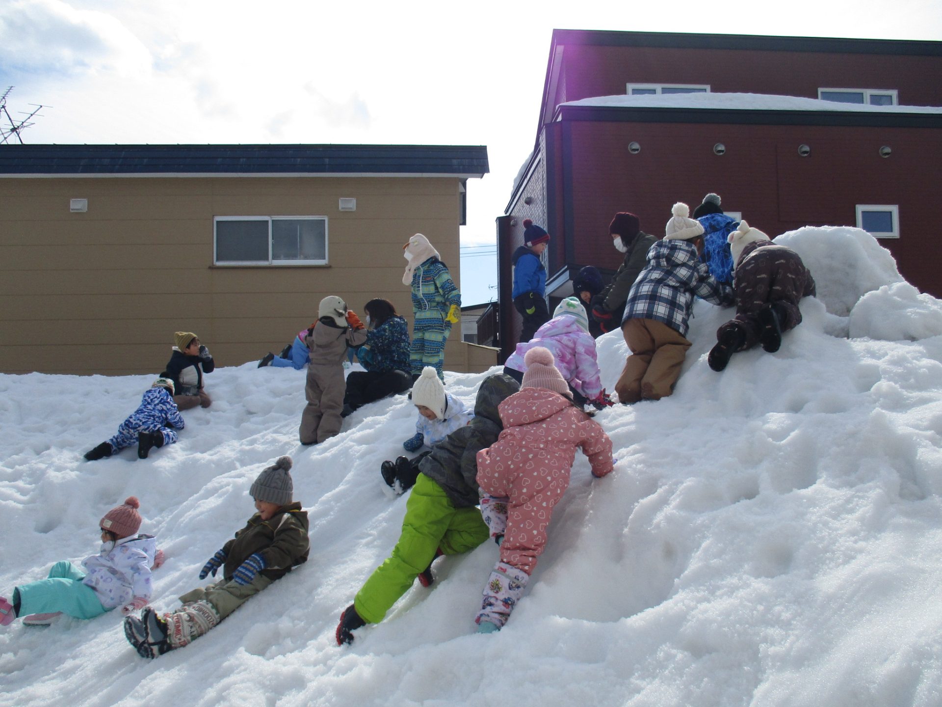 雪山からお尻で滑ってきたり、お友だちと穴を掘ってみたり・・様々な遊びを楽しんでいました🎵