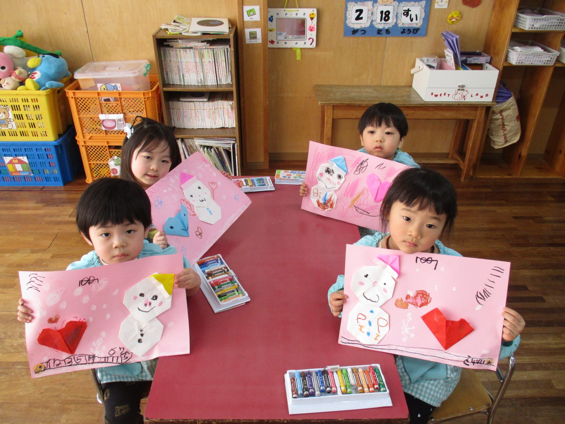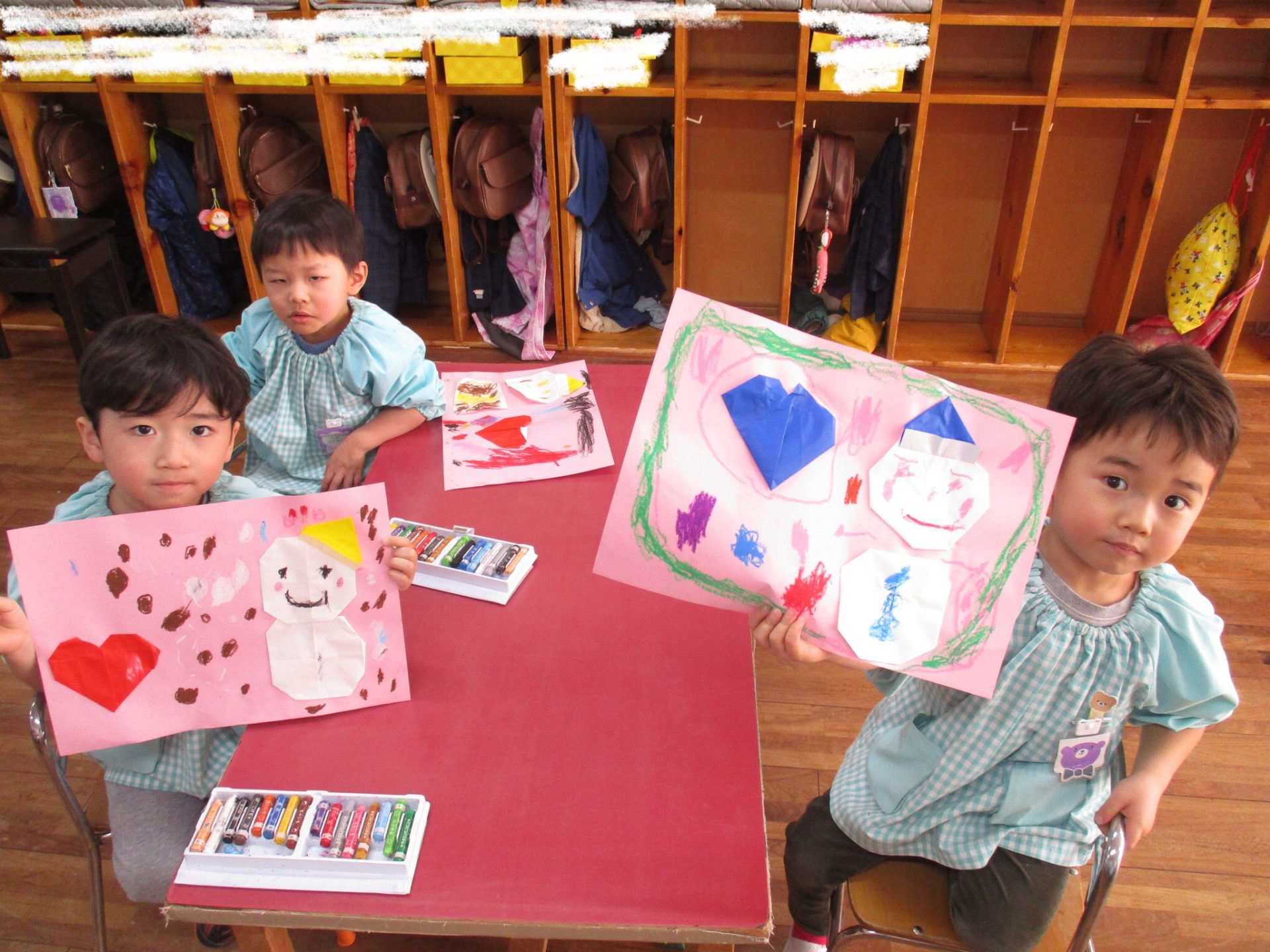今日は昨日折り紙で作った雪だるまやハート折り紙の周りにクレヨンで描画を行なっていきました。