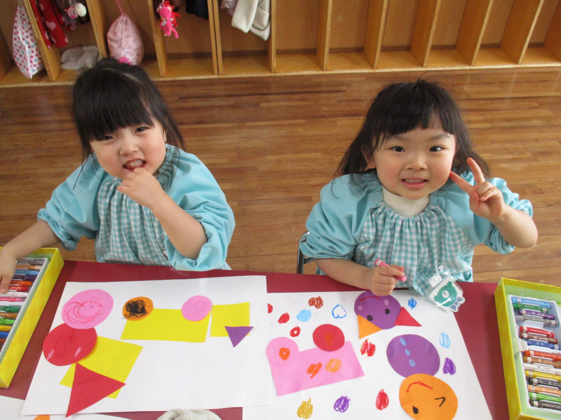 今日はお部屋で三角・丸・四角など色々な形に切っておいた色画用を組み合わせて、様々な物を作っていく活動に取り組んでいました。