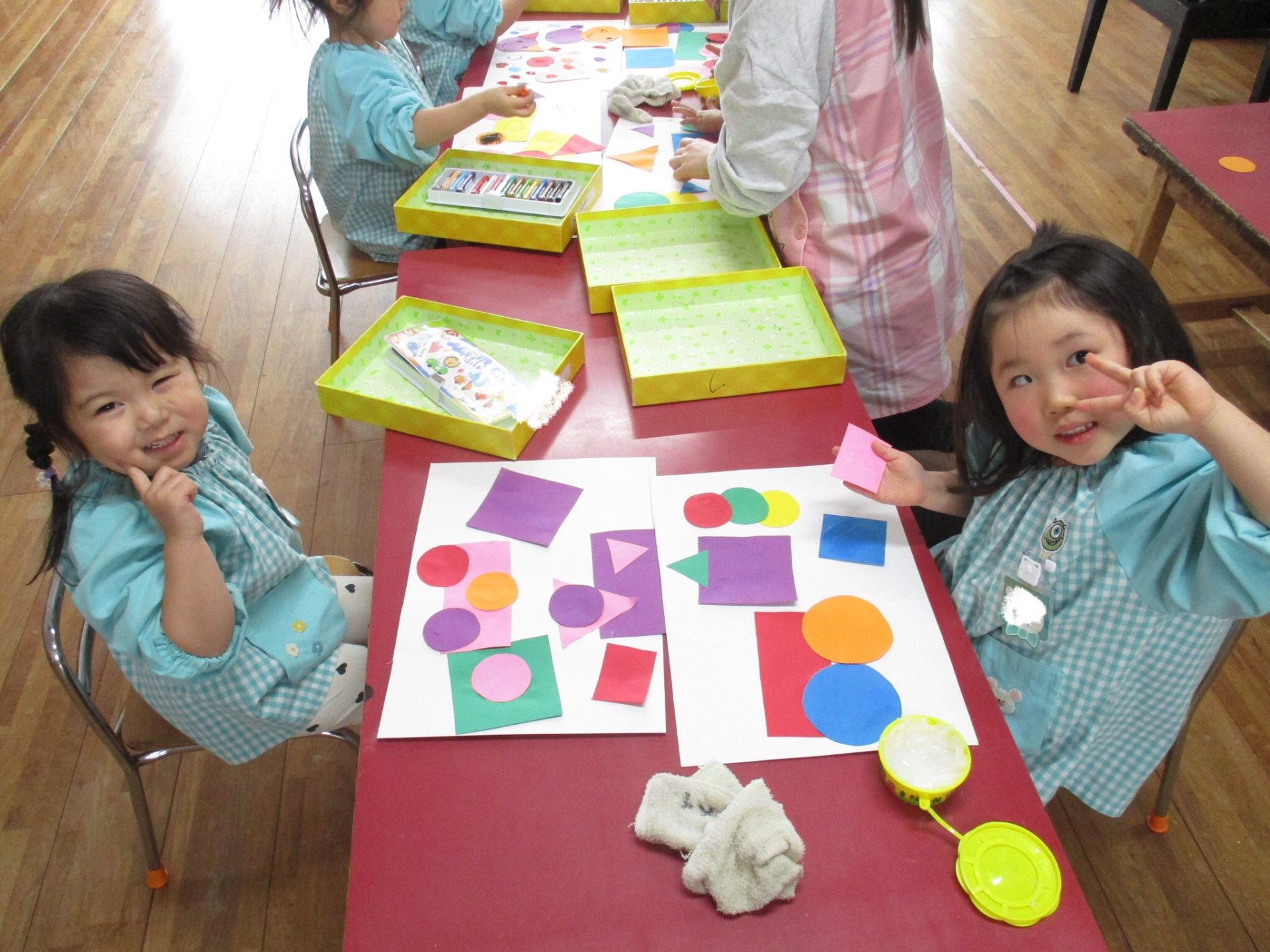 ホールで形探しゲームをしてから活動に取り組んでから、活動を行なったので形を手にするたびに「三角だ〜!」「四角とくっつけようかな?」など想像を膨らませながら取り組む姿が見られていましたよ🎵