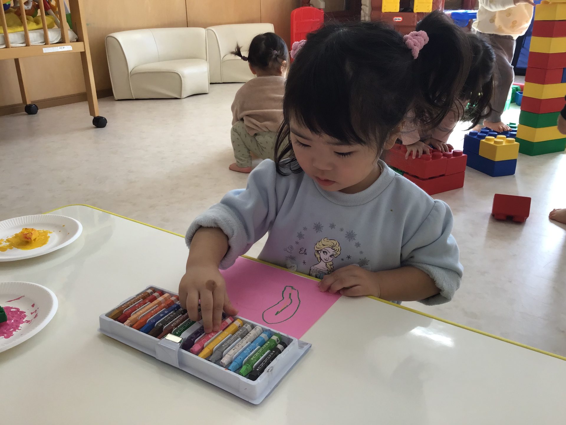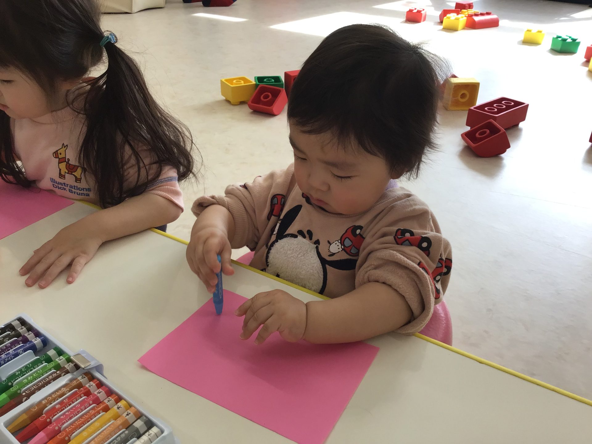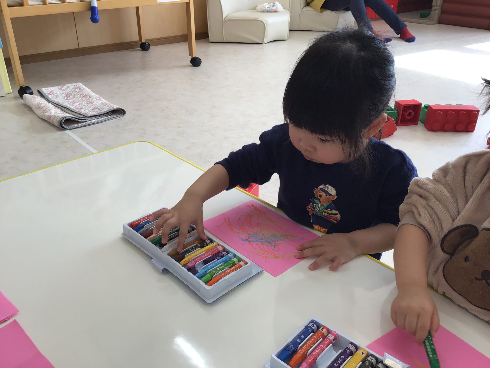 それぞれの好きな色のクレヨンを手に持つと色画用紙にグルグルと、なぐり描きをしていましたよ♩
