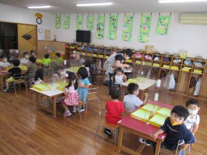 すみれ組さんはうちわ制作の続きを行なっていました。今日はハサミを使う作業もありましたが、みんな真剣な表情で取り組んでいましたよ!