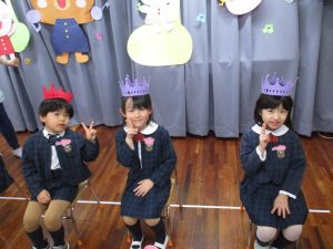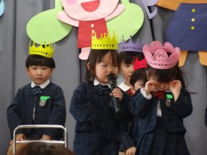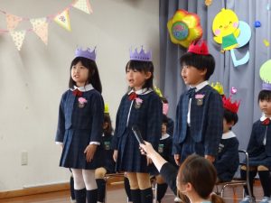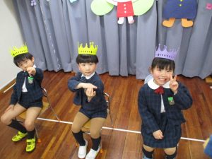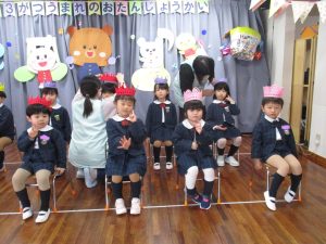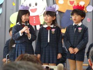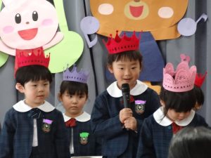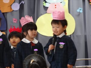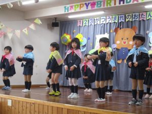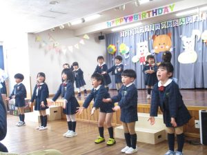 まずは元気に朝の歌を歌い、年長組さんの挨拶でいよいよお誕生会スタート!!