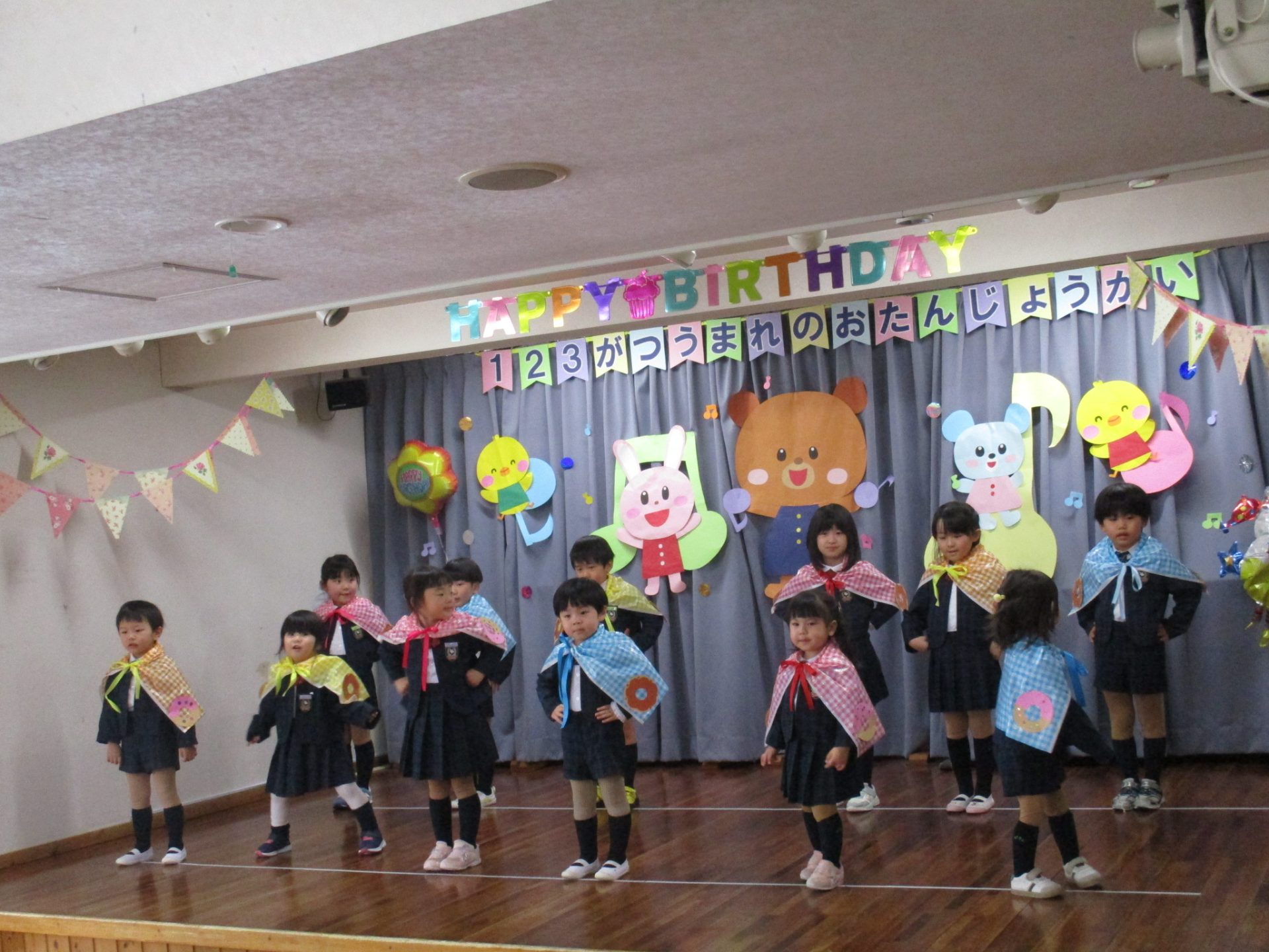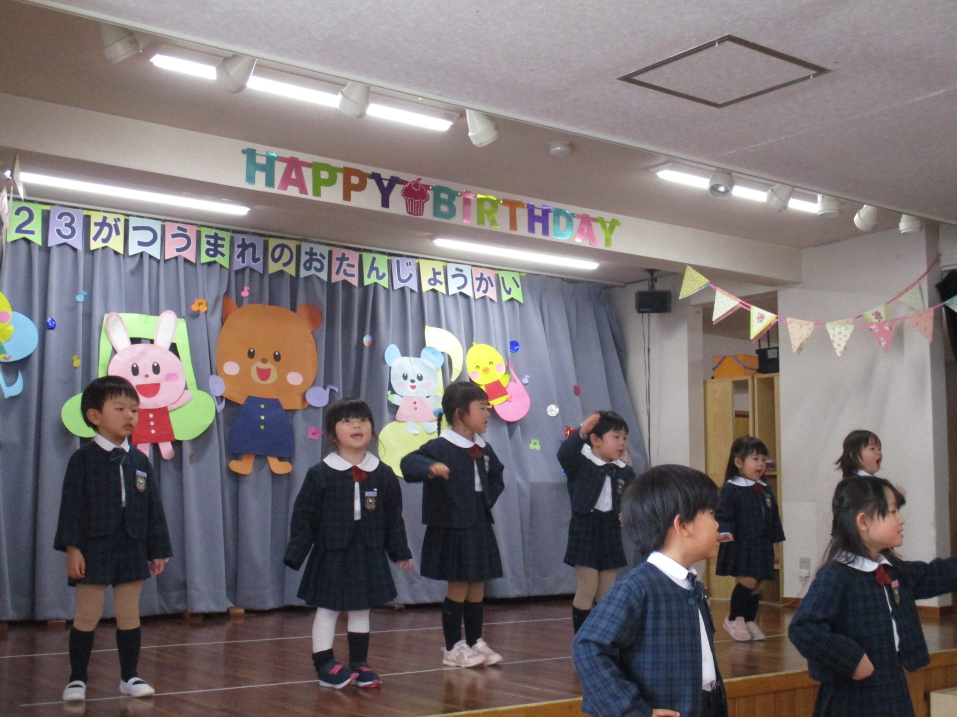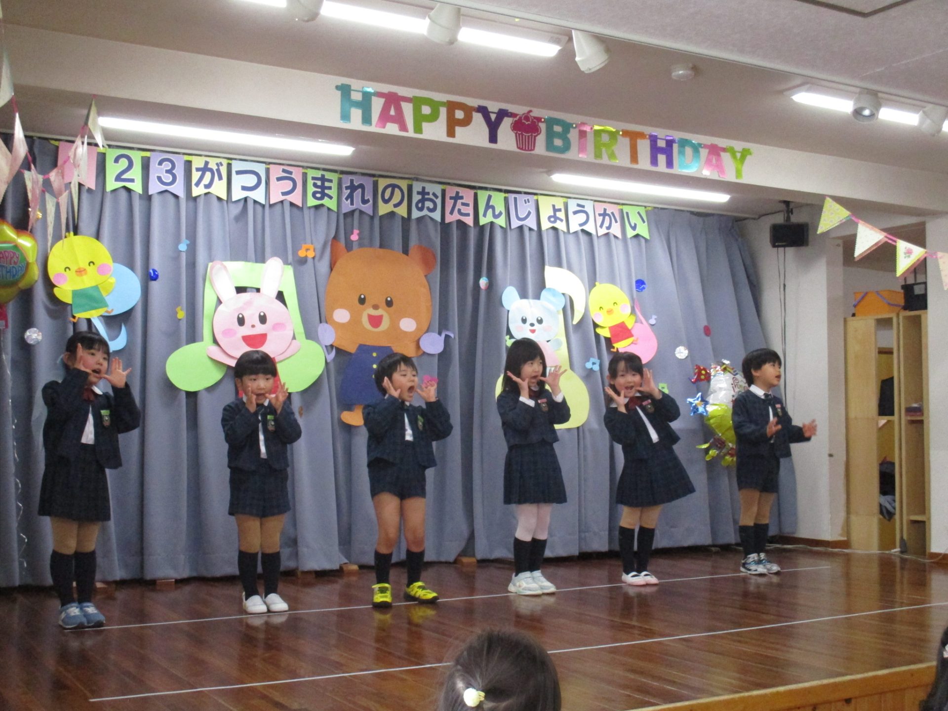 まずは元気に朝の歌を歌い、年長組さんの挨拶でいよいよお誕生会スタート!!