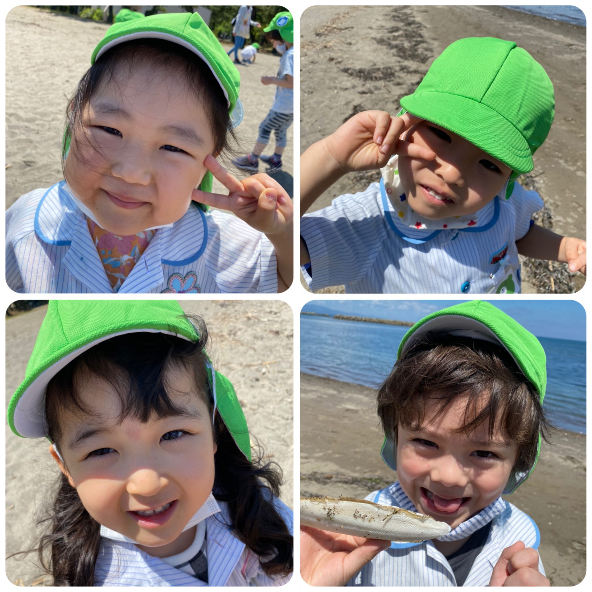 合浦公園に着き大きな汽車へ向かうと、その先で孔雀が大きな羽を広げてお出迎えしてくれていました✨たくさんの鳥を見ながら海の方へ行くと、子ども達は目を輝かせながら貝殻を探したり、長い木の棒を探したりと楽しそうに遊んでいました😁