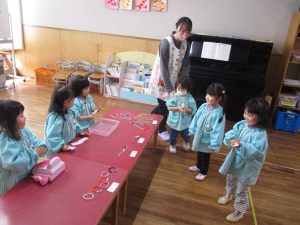 今日は昨日作ったアクセサリーを使って、お店やさんごっこをしていました。