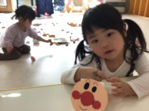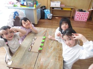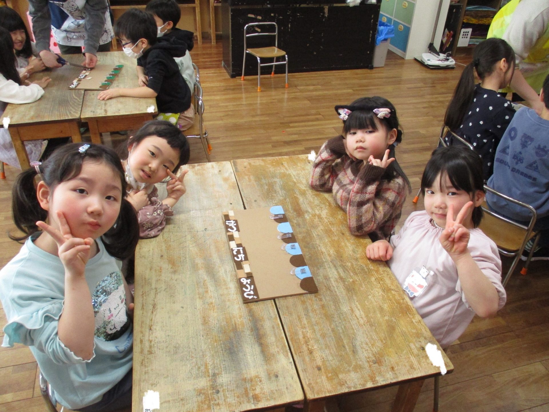 今日は進級が近づいているので、よりカッコいい年長組になれる様に・・とゲームをしながら箸練習や名前書きの練習をしていきました。