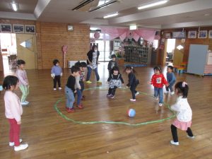 ルールの確認をしてから始めると「きゃ〜!!」と歓声を上げながら逃げて、ボールを転がして・・・と賑やかな姿が見られていました!