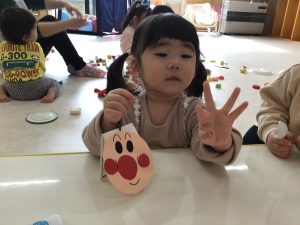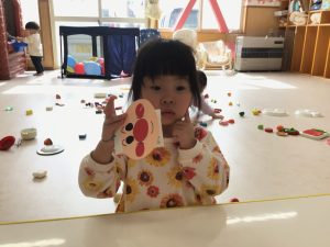 今日はペットボトルキャップと牛乳パックを切ったものを使って、カスタネット作りをしていました。