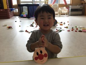 子どもたちが大好きなアンパンマンを牛乳パックに貼り付けて、キャップが2個当たるように固定すると「カチカチ」と良い音が♩