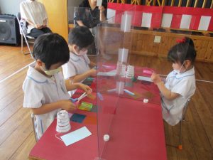 まずはキラキラ光る・クリア素材の折り紙をハサミで切っていく作業でした。細かく切る子・様々な形に切っていく子・しっかり大きさを揃えて切っていく子など、様々な姿が見られていました。