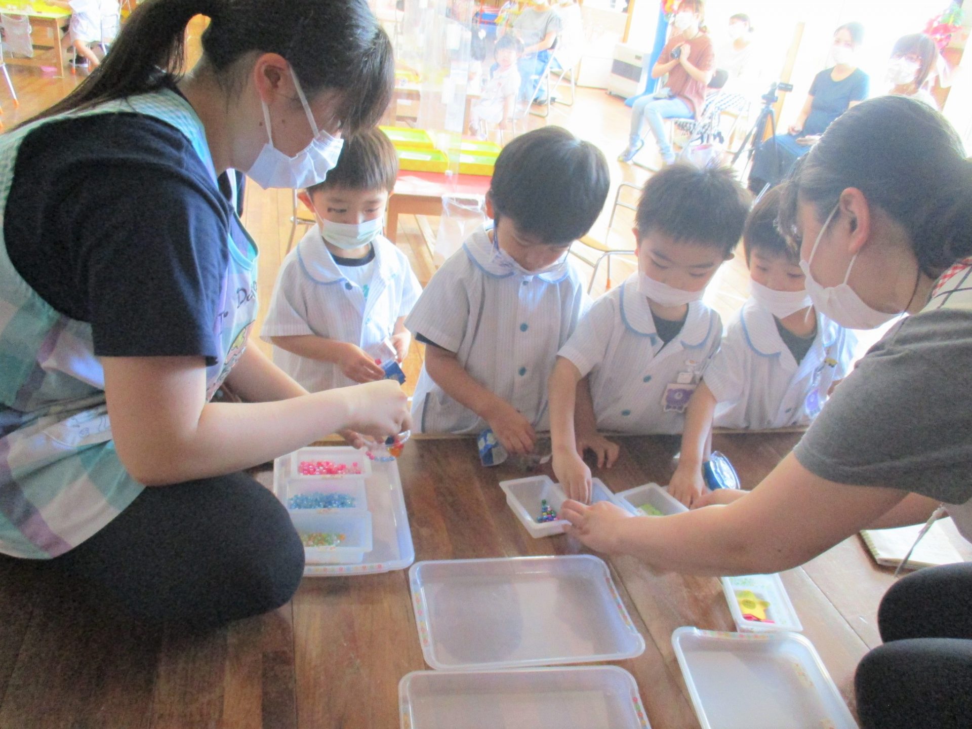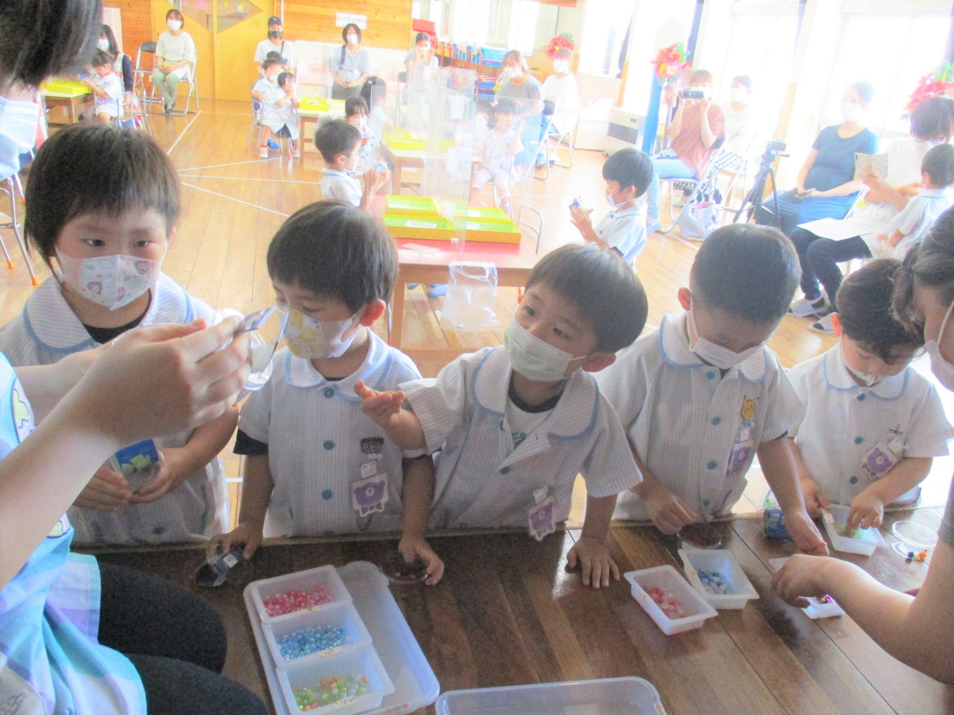 その後ビーズを先生から受け取っていきました。星型・キラキラな物。。様々なビーズが用意されていて子どもたちも喜んでいましたよ。
