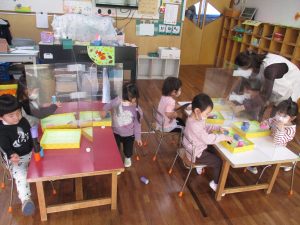 すみれ組さんは秋祭りの制作に取り組んでいました。紙コップやビーズなど、様々な物を使いながら取り組んでいました。完成が楽しみですね♪