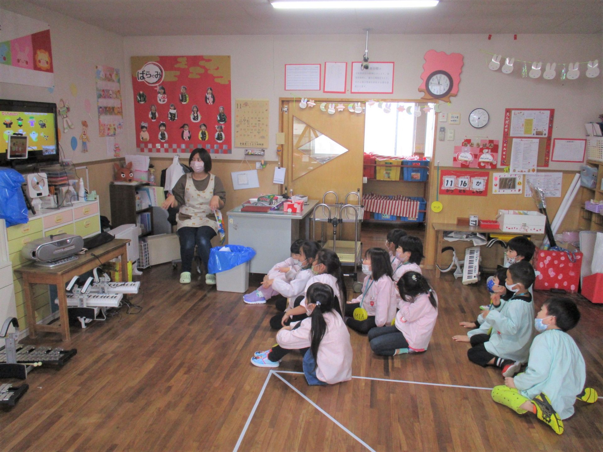 すみれ組さんは、おでん作りの続き作業を行なっていました。今日はハサミを使って『こんにゃく』を作っていましたよ。「先生見て~!」と出来た物を自慢げに見せてくれました♪