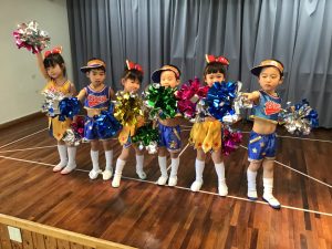 チアリーダーをテーマにしたお遊戯でした。元気な子が多かったのでお遊戯もキビキビと踊ってくれましたね。振り付けも覚えやすかったようで、この曲が掛かると、クラスみんなが踊っていた位盛り上がっていましたよ♪