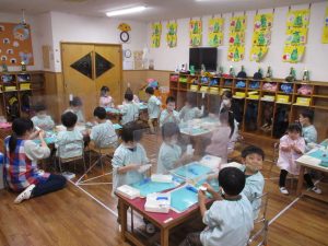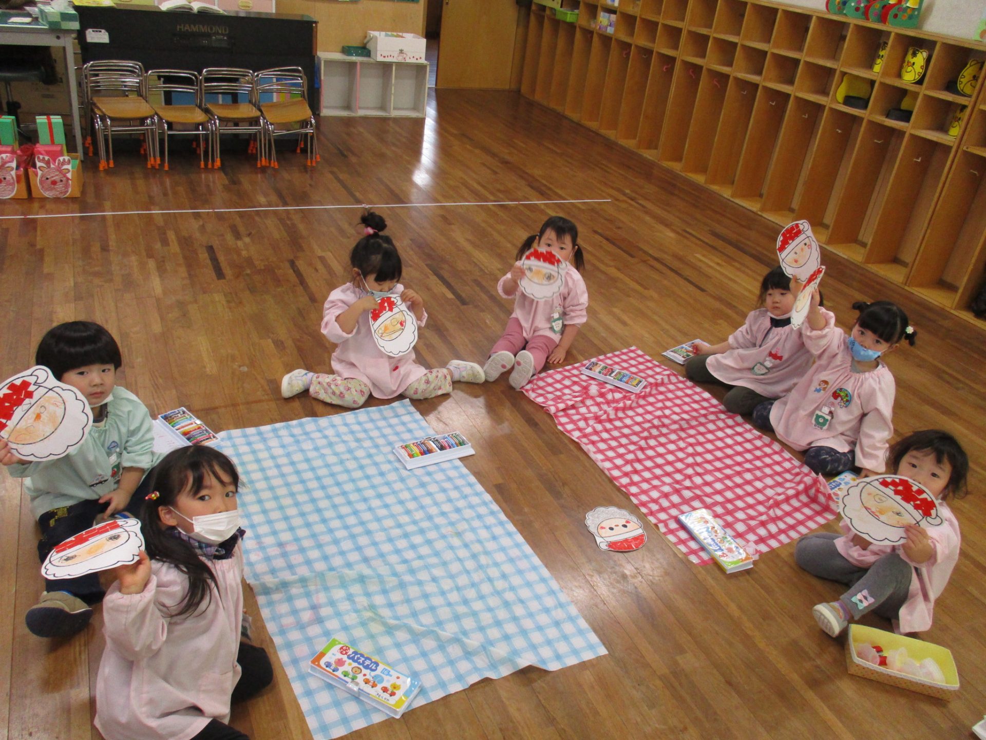 つぼみ組さんはサンタさんの顔型の画用紙に折り紙でちぎり貼りをしたり、クレヨンで表情を描き加えていく作業を行なっていました。個性が良く出た可愛らしいサンタさんが沢山できていましたよ♪
