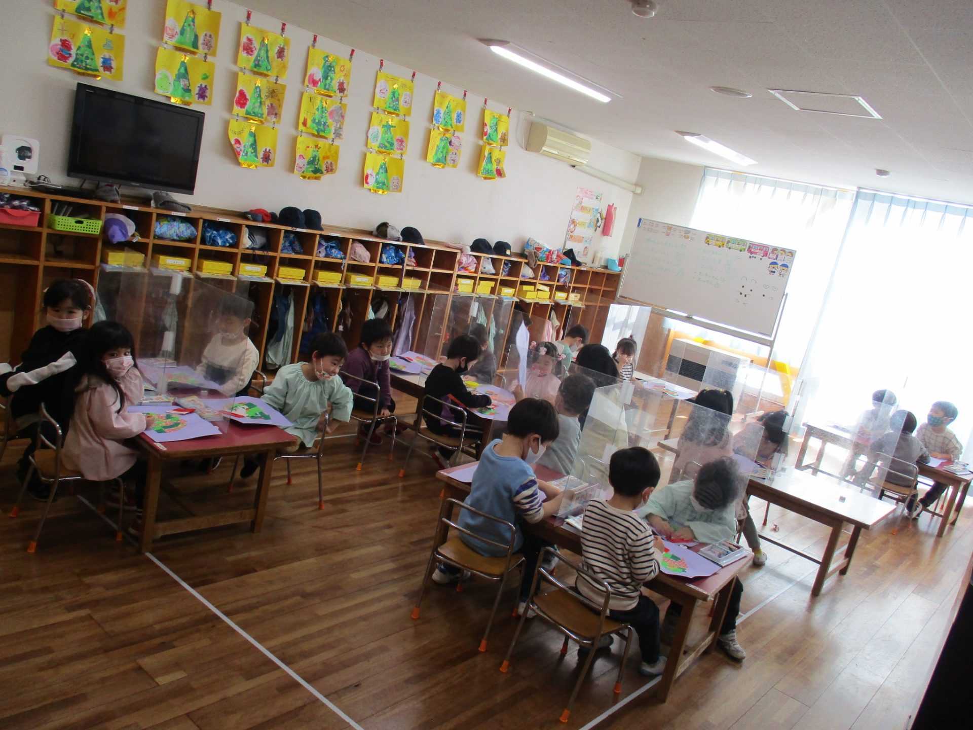 すみれ組さんも昨日まで取り組んでいた獅子舞作りの続き作業を行なっていました。のりで貼り付けられた獅子舞はとてもカラフルで可愛らしい仕上がりになっていましたよ♬