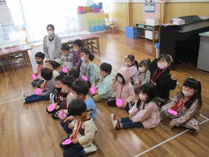 さくら組さんも昨日の折り紙製作の続き作業に取り組み、今日はお勉強の時間もあったようです。子どもたちは、みんなニコニコで参加していましたよ!