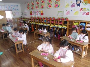 きく組さんは紙粘土を使って『ひし餅』を作っていました。白い紙粘土にぴんく・きみどりの着色をした物で作ったので、いつも以上に粘土を楽しんで行なう事ができた様です♬