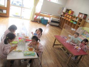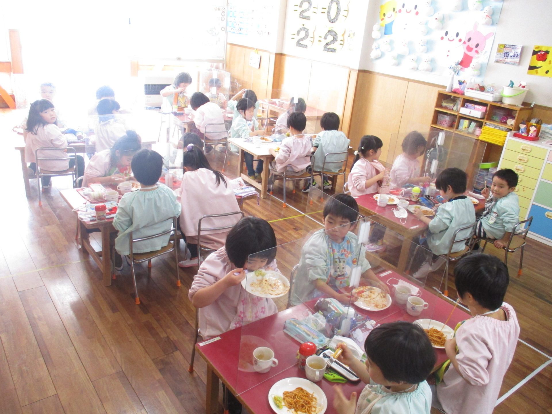 今日のメニューは子どもたちが大好きなスパゲティです♪口の周りをミートソースだらけにしながら「美味しい!!」とニコニコで食べてくれました。