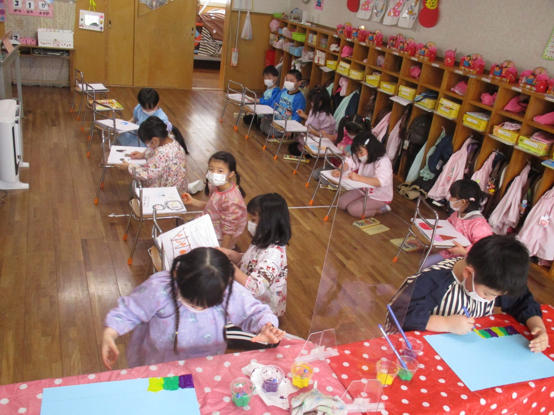 さくら組さんは絵の具活動を行なっていました。順番に絵の具を塗っていくのですが、待っている間はお絵描きを楽しんでいて、楽しそうに活動に参加する姿が見られていましたよ♪