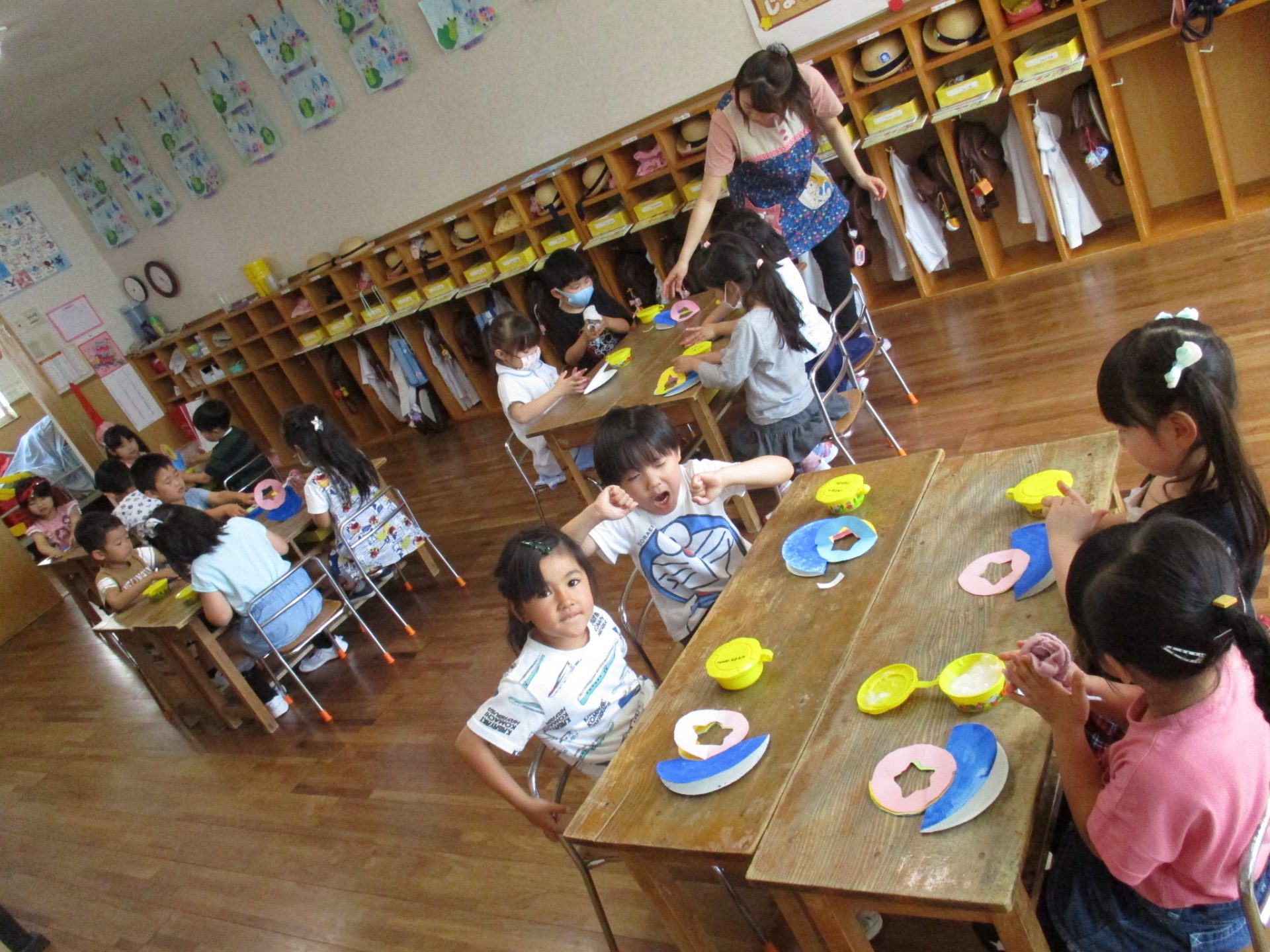 ★制作★2020.06.23全体 今日は七夕制作に取り組んでいるクラスが多かったです。 それぞれのクラス・学年によって様々な飾りが出来ています。 子どもたちも完成を楽しみにしながら、一生懸命に取り組んでくれていますよ。 のりやハサミの使い方もだいぶ上達してきていました! 年長組さんは体操や盆踊りの練習も行っていて、とても楽しそうに踊る姿が見られていましたよ♪ 今日の子どもたちの姿の写真です。ばら組・すみれ組は活動に間に合わなかったので、お給食の姿を撮影しました。