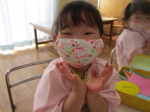 すみれ組・つぼみ組さんはこどもの日制作を行っていました。目玉をペンで描き入れ、貼り付けていくと本物に近づいてきた事に嬉しそうにしていました。お花紙を丸める作業も上手に行っていましたよ!