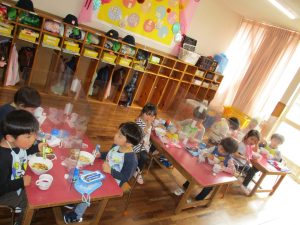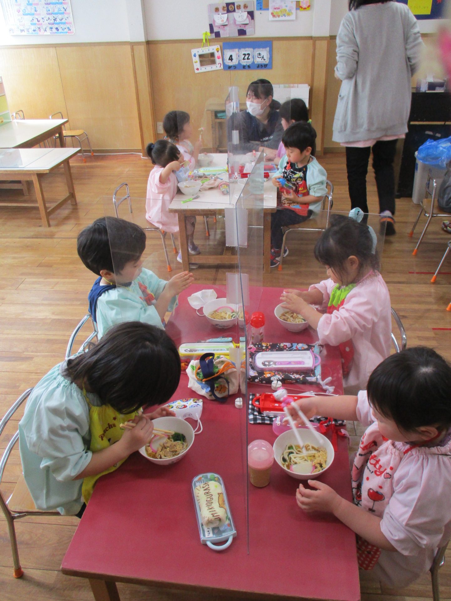 今日はお給食の様子も載せておきます。麺類は子どもたちも食べやすい様で、みんなアッという間に完食していました。