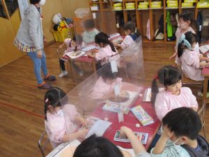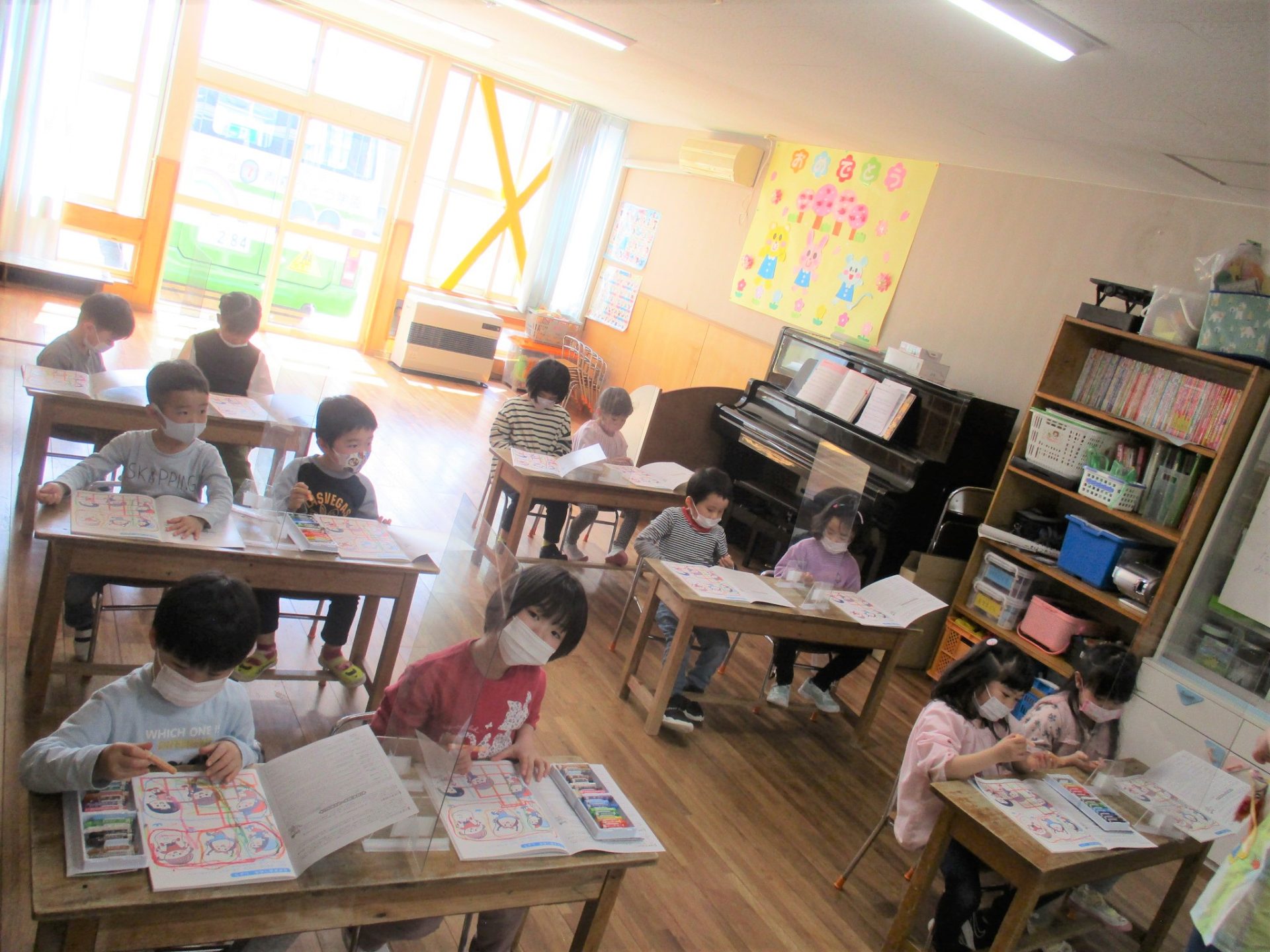 きく組さんはゲーム遊びを行っていました。ジャンケンをして勝った子がイラストに色を塗ることができて、誰が一番最初に全てのイラストに色を塗るかを競い合っていました。勝つたびに「やったー!!」と大喜びでした♪