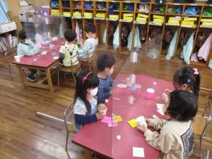 きく組さんは紙コップを使って、『けん玉』作りをしていました。紙コップに好きな色の折り紙を貼り付けていく作業では「僕は黄色にしたよ!」「僕は黄緑色なんだ〜!」と会話を楽しみながら取り組んでいましたよ♪