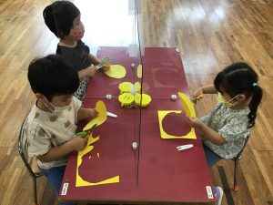 模様のついた折り紙をハサミで適当な大きさに切って、パイナップル型の画用紙の上に貼り付ける作業を行なった様です。とても夏らしい作品が出来上がっていました♪