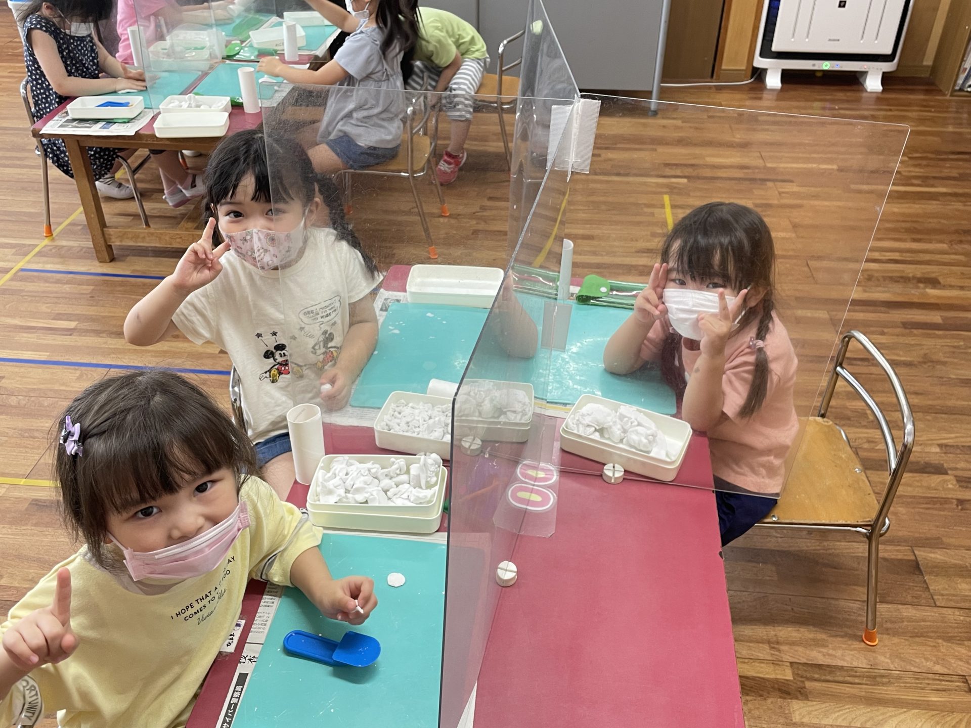 今日はトイレットペーパー芯を1個ずつ渡して、好きな形に折り、粘土で型抜きを楽しんでいました。上手に形を作れると「先生見て!」とニコニコで披露していましたよ♪