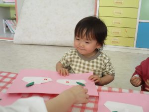 今回は『雪うさぎ』を作る様で、耳・目・花を貼り付けていきましたよ!