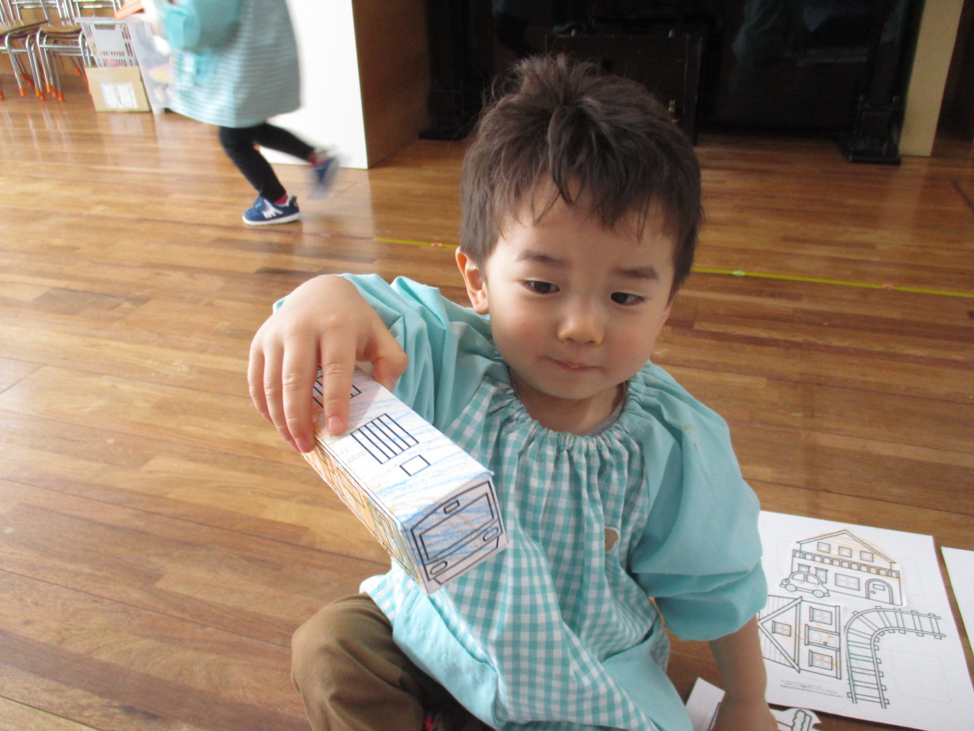 線路にイラストに色を塗って、駅や家の建物も作ったりしてから、お部屋の床に並べていくと、早速、電車を走らせて楽しむ姿が見られていましたよ♩